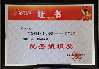 我院去年根据省教育厅要求,在学院领导孙勇副书记、李媛芬副书记的统一指挥下,昆明学院庆祝新中国成立60周年系列活动领导小组推选出我院学生9个歌舞类节目、教工20件美术作品,参加云南省教育厅主办的“云南教育艺术展演暨‘祖国万岁’歌咏活动”,成绩斐然,为展演活动做出了积极贡献,获得教育厅好评。