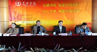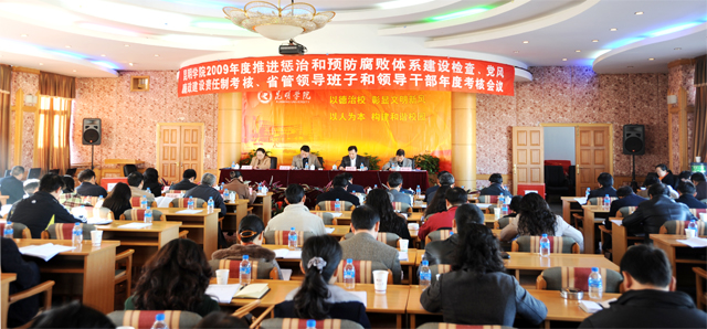 我院党委梁晓谷书记代表学院党政领导班子从以下几个方面向考核组和全体到会人员作了《昆明学院领导班子2009年度考核综合自查报告》的汇报:一是加强班子自身建设,提高领导学院科学发展的能力和水平;二是发挥领导核心作用,努力开创学院改革发展的新局面;三是推进惩治和预防腐败体系及党风廉政建设,不断增强领导干部拒腐防变和廉洁自律的自觉性;四是以建设平安和谐校园为目标,全面推动综合维稳工作,为学院改革发展创造和谐稳定的条件。