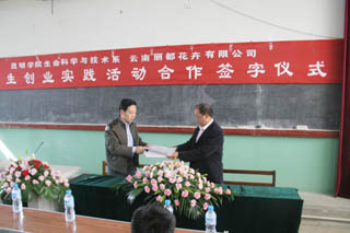 昆明学院生命科学与技术系党总支书记翟书华老师首先致欢迎词,他说丽都花卉公司与我系的合作可以共创多赢的局面,学生可以通过社会实践提高自己的技能水平,企业也可以选拔到更优秀的人才。生科系团总支书记周宇老师宣读了《关于为大学生提供创业实践活动场所的合作协议》,接着丽都花卉公司领导介绍了丽都花卉公司的成长和现状,并感谢了生科系老师和同学的大力支持。最后院团委何昊宸书记讲话,他充分肯定了生科系的创业实践活动,并鼓励同学走出校门,走向社会、接触社会、了解社会,并在社会实践中锻炼和提高自己的综合能力,为将来的就业打下坚实的基础。