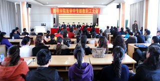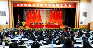 陈世波院长在会上作重要讲话。陈院长首先对两校成为昆明学院大家庭中的成员表示欢迎,同时感谢两校领导班子和全体教职员工,在合并期间积极按照市委市政府和学院有关指示、工作部署所做的工作,肯定两校为顺利并入昆明学院所做的工作和努力。他说农学和医学中专部都有50多年的办学历史和丰富的办学经验,为昆明市培养了大批的农学和医学技术人才,为我省的经济社会发展,尤其在培养农业和医疗运用型技术人才上做出了很大贡献。他指出,在两校区分别召开教职工大会,标志着两校合并到昆明学院的各项基础工作圆满告一个段落,两校工作已进入学院统一部署轨道上来,今后要适应学院的大发展,全面实施战略转移,集中精力抓内涵建设,努力提升学院核心竞争力。陈院长最后对农学、医学中专部负责人和广大教职工提出五点希望:一是统一思想。统一思想对合并非常重要,是工作顺、人心和、事业兴的关键。要把思想统一到市委市政府的指示上来,统一到今天学院党委在教职工大会的工作部署上。二是提高认识。提高认识是做好各项工作的前提和保证,希望学院广大干部和教职员工要把认识提高到高等教育上来,转变到提升本、专科的办学和教育质量上来。三是增进团结互相学习。合并完成后的昆明学院是一所学科齐全的综合性应用型本科院校,在文化和思想上形成了多校融合的独特的多元文化,这些都需要有一个思想的适应和转变过程,需要我们在工作中团结一致,互相学习,这样才能变不利为有利,变阻力为动力。四是加强建设。昆明学院的合并工作及今后的建设发展,一直得到市委市政府的关怀和大力支持。学院今后的建设发展,主要应放在学科与专业建设上,进一步提升本、专科办学和管理水平,加强科研建设,做好社会服务工作,为社会培养更多的适应社会需求的应用型人才。