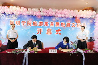 会上陈世波院长作了主要讲话,他介绍了学院的基本情况,指出学院以建设现代化综合性应用型本科大学为目标,正在按照超常规、跨越式、追赶型的思路发展。昆明学院旅游系作为西南地区建立最早的旅游院系,历来注重学生理论与实践教学的有机整合,在培养、训练学生的动手能力和应用技能方面有鲜明特色,负责过高规格的会议接待,在各级各类旅游技能比赛中取得优异成绩,召开本次旅游文化节,就是为了展示我们的教学成果,展示学生的精神风貌与动手能力,为我院与旅游企事业单位、兄弟院校、旅游组织之间搭建交流合作的平台,今天与部分知名旅游企业共建教学实习基地,就是为了进一步促进校企合作,实现互利共赢。最后,陈院长宣布昆明学院旅游系首届旅游文化节开幕。
