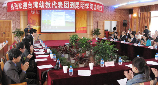研讨会由昆明市台办主任段俐娟主持。昆明市教育局领导发言首先对台湾幼教联合总会的到来表示诚挚的欢迎,然后就昆明的教育大背景作了较详细的介绍。接着昆明学院罗明东副院长对昆明学院的建院情况,院系专业设置,未来发展方向,特别是学前教育系的发展做了重要发言。学前教育系领导唐敏副主任主要针对昆明学院学前教育系的办学历史、专业特色、科研能力、与昆明市各幼教机构的合作等台湾同行们感兴趣的问题,作了深入而细致的介绍。同时台湾幼教联合总会涂会长也把台湾的幼教发展现状等信息作了交流。