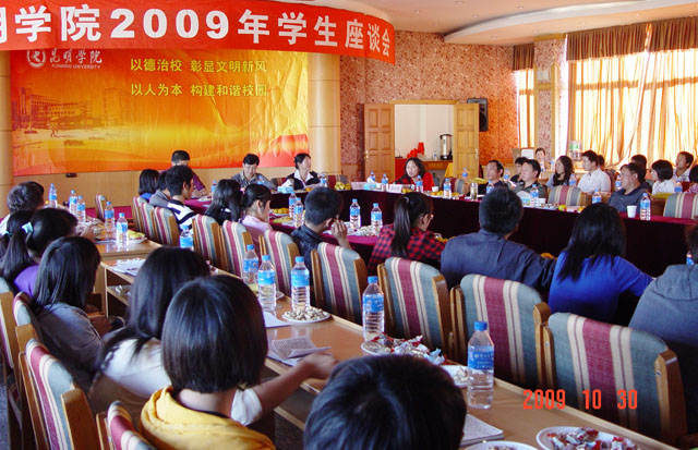 为期两天的昆明学院2009学年学生座谈会于10月29日、10月30日分别在龙泉路校区、新迎路校区、人民西路校区(含昆师路校区学生)、体院路校区举行。我院孙勇副书记、熊晶副院长,院办、学生处、教务处、团委、保卫处、后勤处等学生工作指导委员会相关成员单位领导、各校区综合办以及城建系、美艺系等系部的相关负责人分别出席在各校区举行的学生座谈会,听取并现场解答了部分同学提出的意见和建议。参加此次学生座谈会的各系学生代表共计130余人。