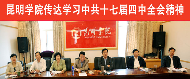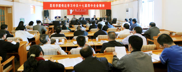 中国共产党第十七届中央委员会第四次全体会议于9月15日至18日在北京举行。出席这次会议的有中央委员193人,候补中央委员163人。中央纪律检查委员会委员和有关方面负责同志列席会议。党的十七大代表中部分基层党务工作者、基层党员和从事党建工作研究的专家学者也列席了会议。全会由中央政治局主持。中央委员会总书记胡锦涛作了重要讲话。全会听取和讨论了胡锦涛受中央政治局委托作的工作报告,审议通过了《中共中央关于加强和改进新形势下党的建设若干重大问题的决定》。习近平就《决定(讨论稿)》向全会作了说明。   党的十七届四中全会结束后,中共云南省委、昆明市委迅速召开干部会传达会议精神。我院党政主要领导参加了省市传达中央精神会议后,于9月24日召集党委会,专题研究部署全院传达学习、贯彻落实十七届四中全会精神相关工作。