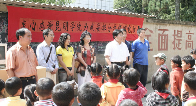 9月11日上午, 在罗明东副院长的亲自率领下,院办杨茂泉副主任、资产管理与设备处包兴副处长等一行7人代表昆明学院向昆明市西山区谷律乡中心学校进行了电脑捐赠。捐赠仪式在谷律乡中心学校妥派分校举行。此次捐赠活动是学院提出的“大学不仅是教学、科研的基地,更应该是服务社会、回报社会的重要窗口”这一办学宗旨的体现。