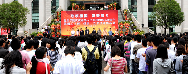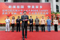 陈院长代表学院党政领导致辞。陈院长说:学院在举国欢庆新中国成立60周年的日子里,举办这次展览的目的在于加深学院师生对新中国伟大历程和辉煌成就认识,弘扬中华民族传统文化的精粹,表达昆明学院师生对伟大祖国的无限热爱之情,讴歌新中国成立60年来中国共产党领导中国人民取得的丰功伟绩,展示昆明学院改革建设发展成果和教职工爱岗敬业、拼搏奉献的精神风貌与智慧才艺。现在,学院全面实施工作重点的战略转移,集中精力抓内涵建设,加快提升学院的核心竞争力,提升办学质量和水平,提升学院在国家高等教育体系中的地位和影响,提高学院对国家和区域经济社会发展的贡献率。   省高校工委宣传统战部桂正华部长代表省委高校工委、教育厅对本次活动的举办表示热烈祝贺。他说:昆明学院本次展览主题突出,贴近生活,题材丰富,形式多样,一幅幅作品深刻描绘教职工对祖国大好河山的深情热爱,从不同角度讴歌了中华人民共和国成立60年特别是改革开放30年来社会主义建设的辉煌成就,展示了昆明学院深厚的文化底蕴,“不拘一格、人才辈出”的校园文化生活,营造出和谐发展的舆论氛围,促进了教育系统文化艺术的交流与发展。