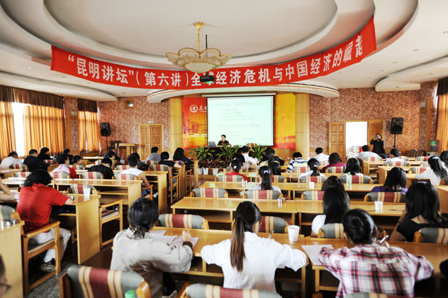 7月1日下午,我院邀请美国哈佛大学博士、美国伊利诺伊州立大学张宏霖教授主讲“昆明讲坛”第六讲,主题为:“全球经济危机与中国的崛起”。报告会由昆明科学发展研究院办公室主任管彦平主持。昆明学院院长陈世波、副院长熊晶及部分系室领导、教师和学生代表现场聆听了张教授的精彩报告。