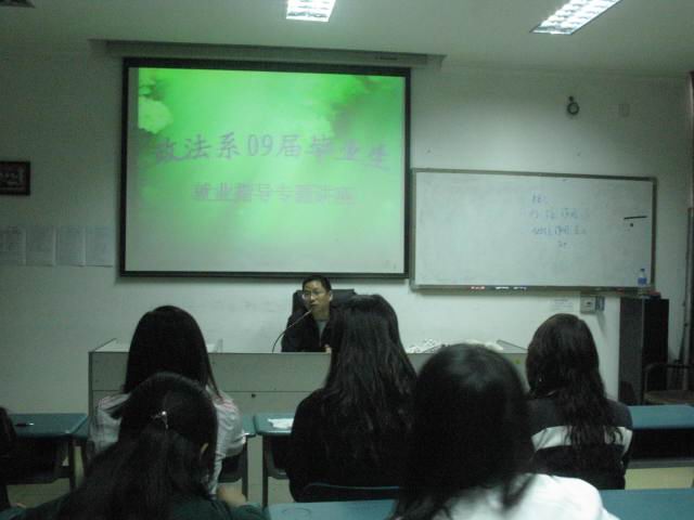 按照学院及政法系《学习实践科学发展观实施方案》的要求,针对今年严峻的就业形势和学生中存在的问题, 4月8日中午,政法系组织了2009届政教、法律专业全体毕业生参加的就业指导专题讲座。讲座由长期从事毕业生就业指导工作的杨为宗老师主讲,与会的还有政法系系领导、班主任及辅导员老师。