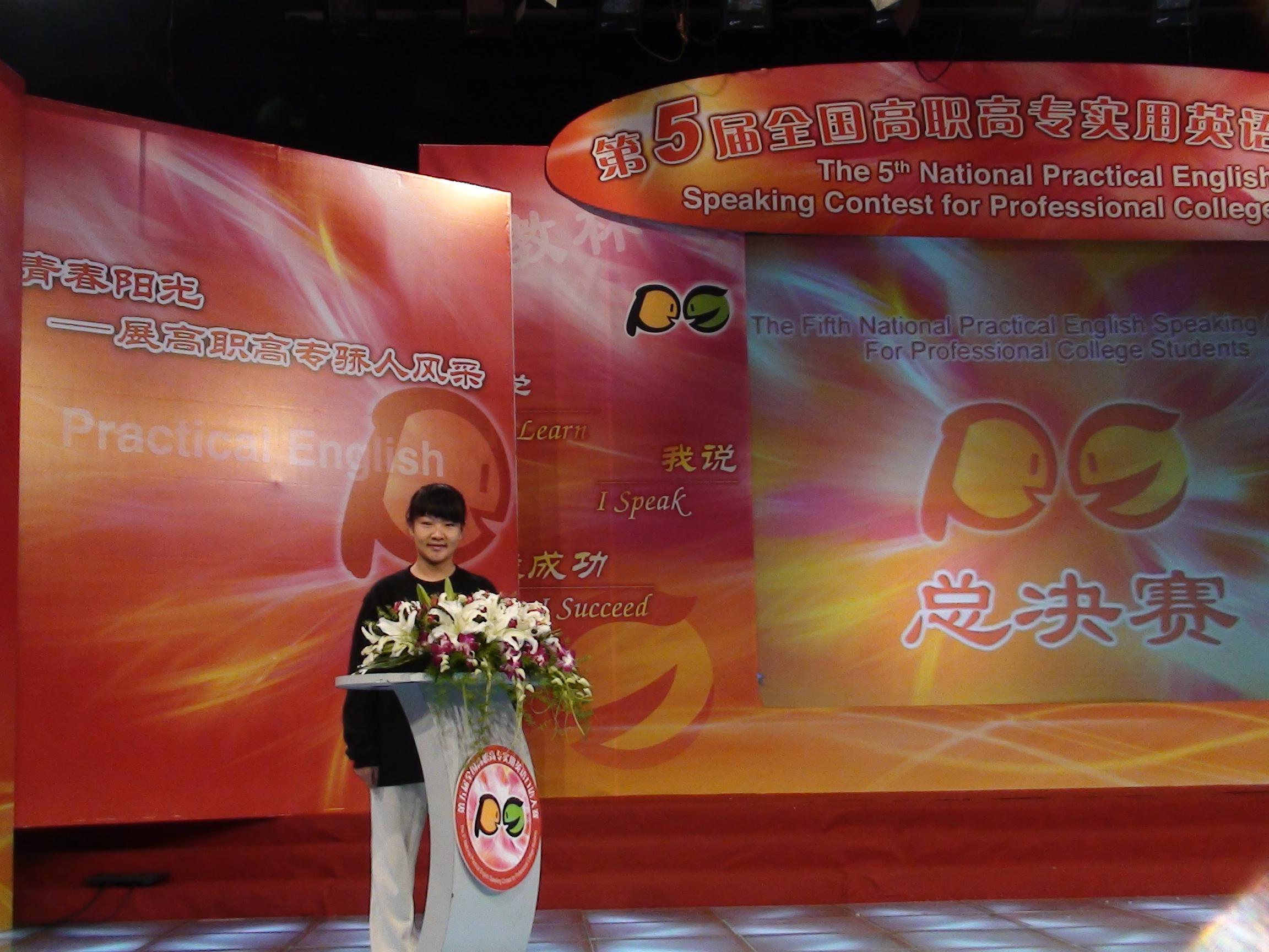 来自全国30个省、市、自治区的58名选手参加了决赛。这些选手均为各省、市、自治区赛区复赛的一等奖获得者,是各地区高职高专学生英语口语方面的佼佼者,代表了全国高职高专学生英语口语的最高水平。整场比赛高手云集、高潮迭起。参赛选手的精彩表现赢得了在场专家评委的高度好评,展示了高职高专学生英语口语能力,体现了高职高专英语教学成果。整场比赛分为上下两个半场举行,任静娴同学经抽签加入下半场的比赛。
