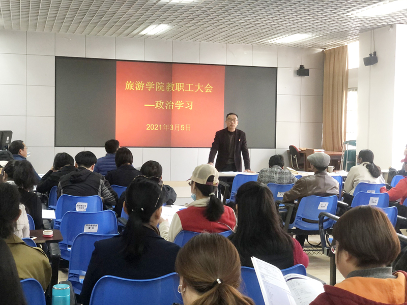 3月5日,旅游学院在惟行楼1105开展2021年第1次全体教职工政治理论学习,集体集中学习《乘势而上 狠抓落实 加快建设高质量教育体系—陈宝生部长在2021年全国教育工作会议上的讲话》《周荣同志在2021年全省教育工作会议上的工作报告》《突出重点 强化责任 坚持高质量发展主线 推动学校事业发展——丁文丽校长在2021年春季学期干部大会上的讲话》和《奋进新时代 担当新使命 聚焦学校“五项重点工作”加快推进学校高质量发展——陈永明书记在2021年春季学期干部大会上的讲话》。旅游学院全体党政领导及全体教职工参加学习。本次活动由党委书记王建华主持并领学。