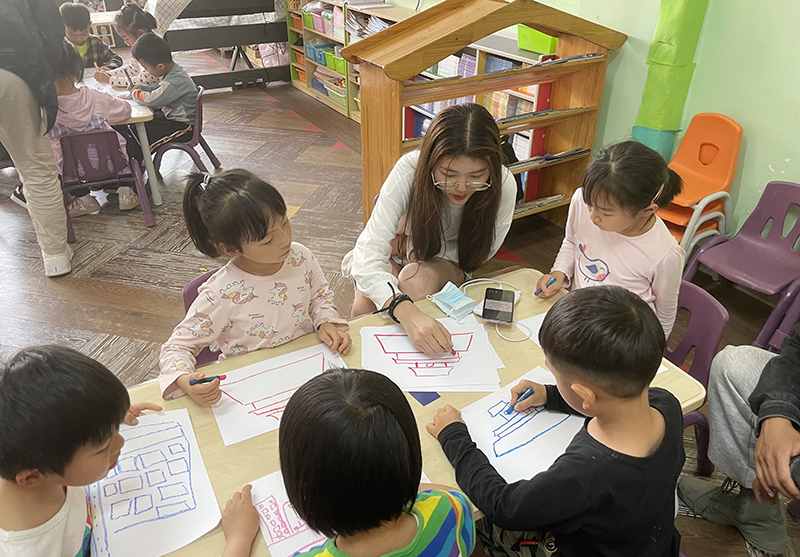 在幼儿园里,志愿者们受到了幼儿园老师和小朋友们的热烈欢迎,小朋友们稚嫩的欢迎声,让志愿者们倍感欣喜。学院志愿者向附属幼儿园捐赠了7件建筑学专业和土木工程专业学生参加公益文化节亲手制作的模型作品,志愿者们绘声绘色为小朋友们讲解了建筑模型的设计理念,并将绿色环保理念生动融入其中。小朋友们真挚渴望的眼神以及对新事物的好奇心和探索欲,让大哥哥、大姐姐们讲解得格外用心、细致。随后,志愿者们来到大班的小朋友中,通过做游戏的方式引导大家说出自己心中的天安门或者小学的样子,并和志愿者们共同在彩纸上画下“心中的天安门”和“心中的小学校”。小朋友与志愿者们现场互动的氛围欢声阵阵、其乐融融。