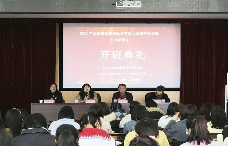10月23日,云南省教育厅民族教育处举办的2021年度云南省民族地区乡村幼儿园教师(村幼)培训班在昆明学院学前与特殊教育学院举办。云南省教育厅民族教育处调研员李宇飞,学校学前与特殊教育学院书记张大卫、副院长高春玲,昆明市教工第一幼儿园园长谭玲媚副出席开班典礼。