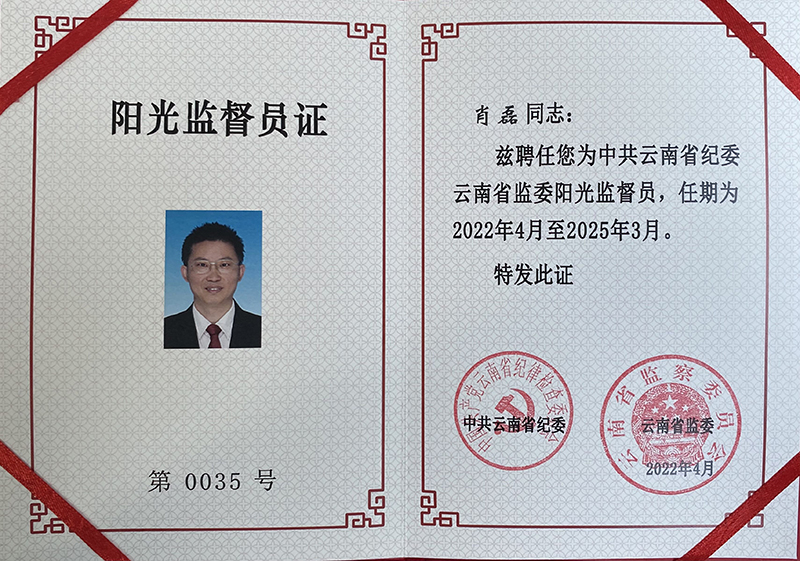 4月26日,中共云南省纪委省监委阳光监督员聘任仪式在云南省委举行,中央纪委委员、云南省委常委、云南省纪委书记、监委主任冯志礼出席会议,为阳光监督员颁发证书并发表讲话。我校民革支部主委、昆明滇池(湖泊)污染防治合作研究中心副主任肖磊参加会议并受聘担任阳光监督员。