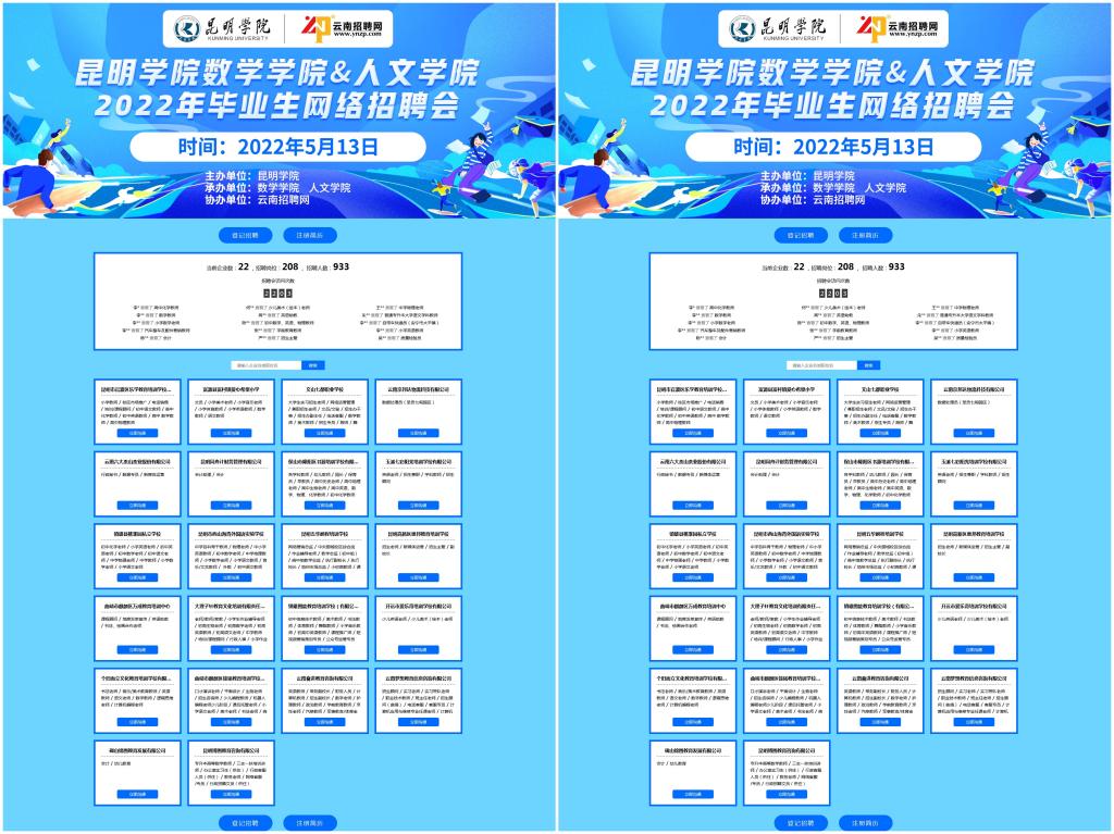 本次网络招聘会由云南招聘网协办,参会企业23家,招聘岗位922个,招聘职位211个。截至目前,数学学院、人文学院共732名毕业生参加了网络招聘会,页面访问量1705次,简历投递149份,发送面试邀请35次。
