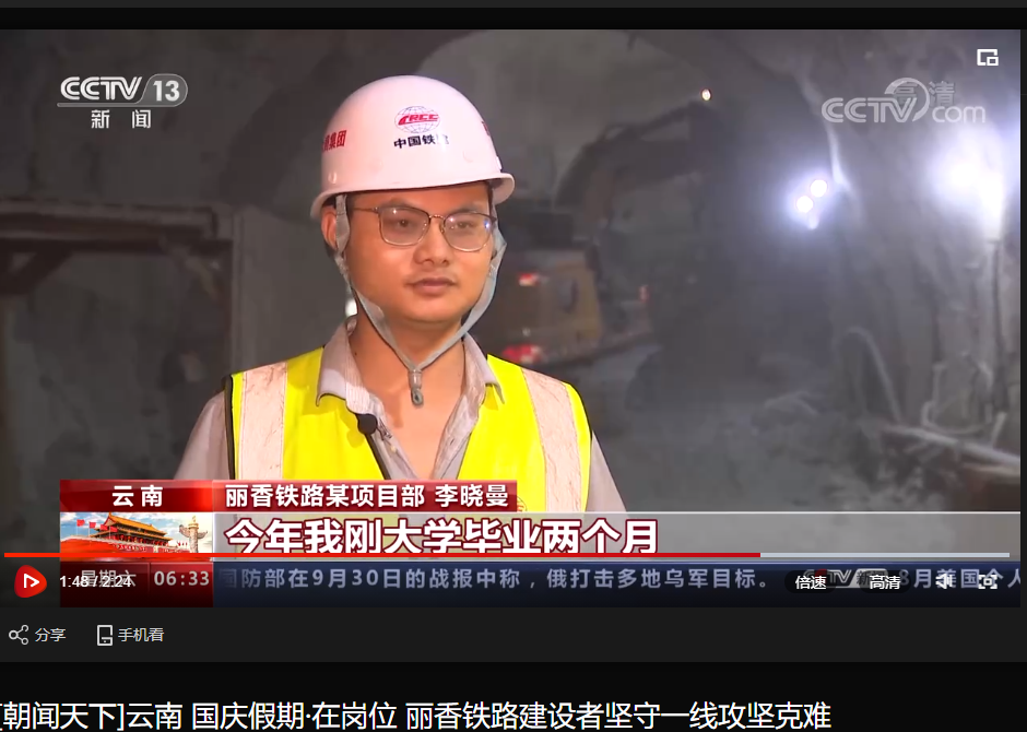 国庆期间,央视新闻频道《朝闻天下》栏目采访报道了国庆假期坚守在丽香铁路一线攻坚克难的建设者们。目前就业于中铁十六局集团第三工程有限公司的我校建筑工程学院2022届土木工程专业毕业生李晓曼在新闻中出镜并接受采访。他说:“一代人有一代人的担当,一代人有一代人的使命,我们就应该为祖国建设添砖加瓦、为民族复兴架桥修路。”