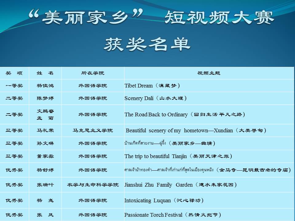 为提升学生对外交流意识、扩大交流范围,两校于2022年6月确定联合举办以旅游为主题的中泰文化短视频大赛。我校于7月发布了举办“美丽家乡”旅游题材短视频大赛活动通知,总计收到三个学院不同专业学生制作的参赛作品,同学们分别通过英语或泰语展示了各自美丽的家乡文化,经对外合作交流处初审,确定10个作品入围复赛,同时泰国佛统皇家大学也报送了10个中文参赛作品。两校评审专家通过复赛终审,分别推选了各自优秀作品。