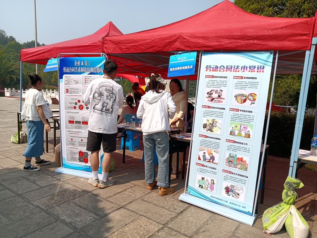为进一步提高毕业生学法、知法、用法的意识,保障自身合法权益,与用人单位构建和谐劳动关系,校妇联与校工会携手昆明市劳模创新工作室专业律师,于4月7日、4月14日走进“昆明市师范类高校毕业生昆明学院专场招聘会”和“云南省2023届高校毕业生昆明经济开发区专场招聘会”现场,开展以“与法同行、携手筑梦”为主题的法律咨询活动,为同学们提供就业法律法规问题答疑服务。