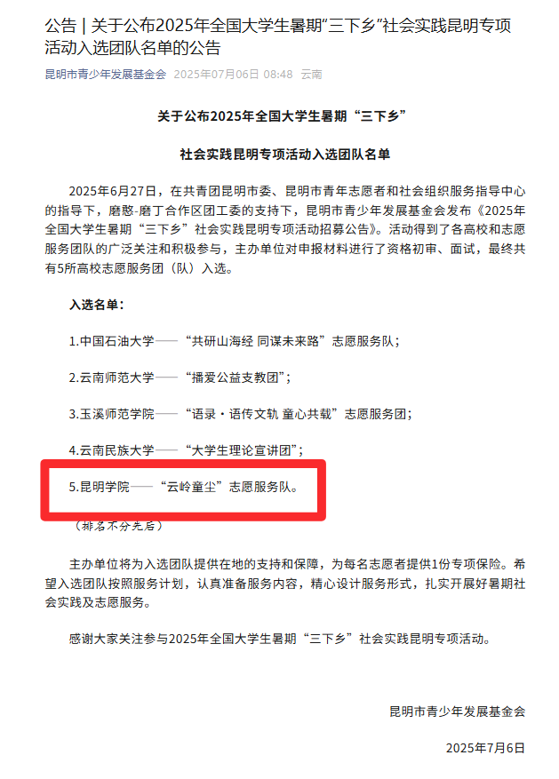 今年暑期,昆明学院团委在学校党委的领导和团省委的悉心指导下,组建了146支暑期“三下乡”社会实践团队,选派156名指导教师,带领3808名青年学生分赴云南、安徽、山东等44个县市基层一线,紧扣“青春为中国式现代化挺膺担当”主题,广泛开展了内容丰富、形式多样的社会实践活动,将爱国情、强国志、报国行自觉融入新时代追梦征程,展现青年担当。
