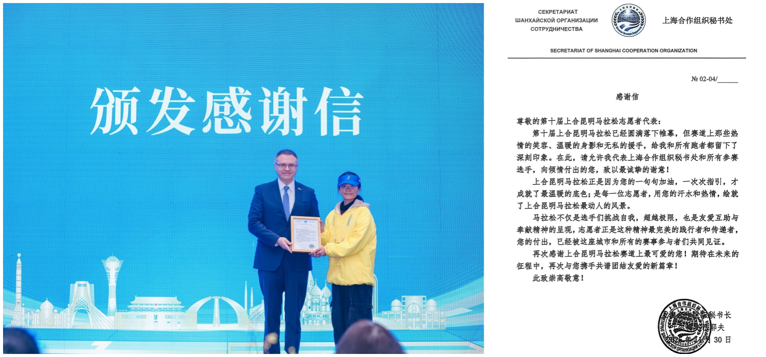 为确保志愿服务质量,自11月22日起,全体志愿者接受了涵盖赛事规则、岗位职责、应急处理、沟通礼仪等内容的六场系统化专业培训。培训期间,志愿者们还积极参与了赛事物料的分装、发放及现场踏勘等准备工作,全面熟悉了服务流程与环境,有效提升了专业服务能力。赛事当日凌晨,3335名志愿者已全部集结完毕,整装待发。赛事期间,他们坚守在起终点服务、赛道指引、存取包服务、补给分发、秩序维护、医疗协助等关键岗位,以真诚的微笑、熟练的操作和有序的协作有力保障了赛事各环节顺畅运行,赢得了组委会、参赛选手及各界来宾的广泛赞誉。更值得骄傲的是,志愿者代表在赛事结束后获得了上海合作组织秘书长亲手颁发的感谢信。这份殊荣不仅是对志愿者辛勤付出的高度肯定,更是昆院青年昂扬风采与时代担当的生动体现。