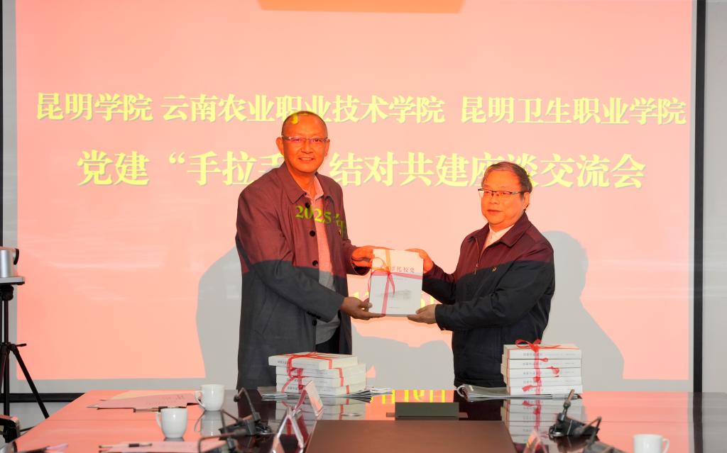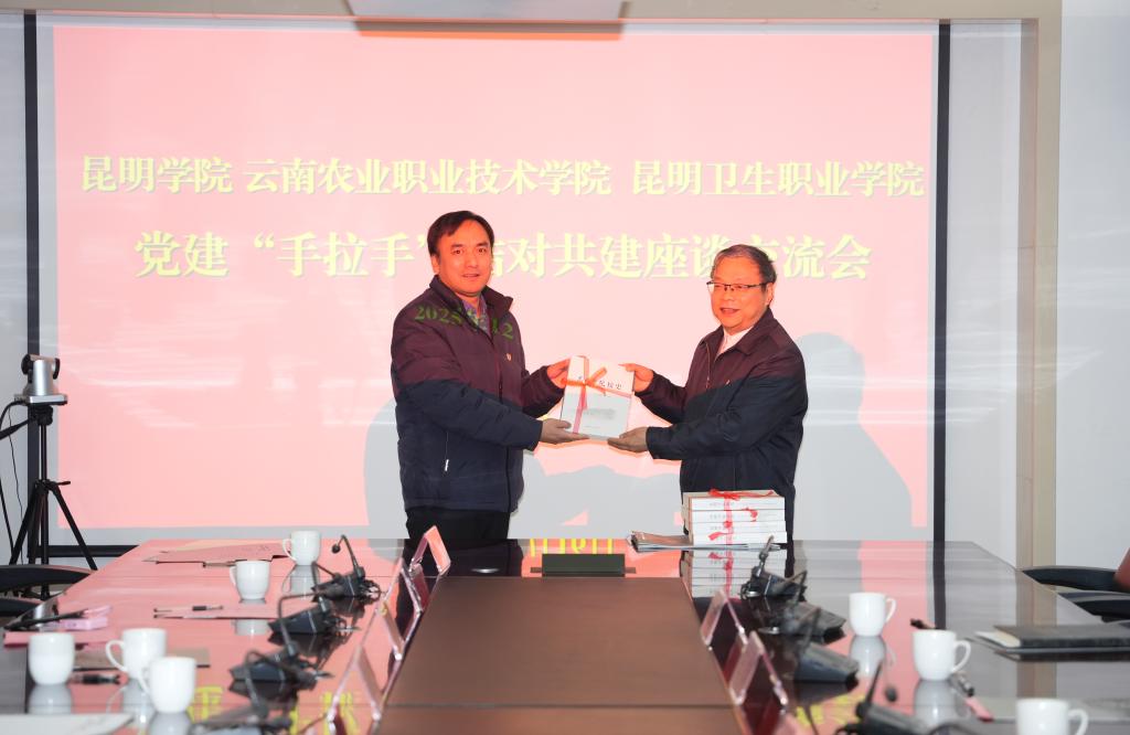 党委副书记王文成代表学校向云南农业职业技术学院、昆明卫生职业学院赠送了《昆明学院校史》