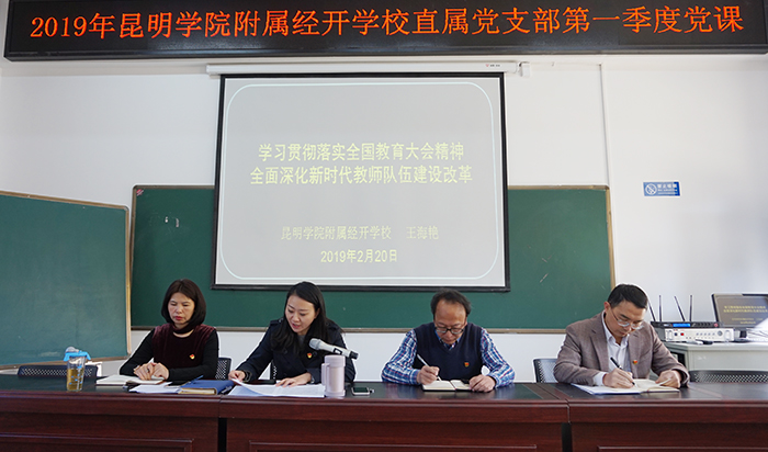 2019年2月20日上午,昆明学院附属经开学校直属党支部第一季度党课在211教室开展。支部书记王海艳同志带领大家共同学习题为《学习贯彻落实全国教育大会精神,全面深化新时代教师队伍建设改革》的主题党课。校长李晋德,副校长罗蓉、李广峰及支部全体党员、入党积极分子、中小学教师参加此次党课学习。