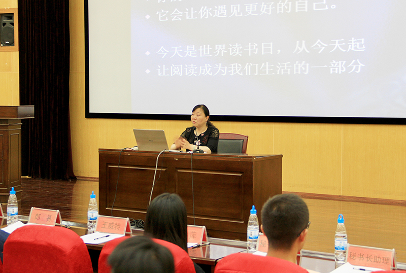 由郎易老师发言指出,开展读书文化节旨在弘扬中华民族的优秀传统文化,加强我校的学风建设、激发学生的阅读兴趣、营造良好的学习环境、展现我校大学生良好的精神风貌。并详细介绍了紧扣主题开展的系列活动,同时希望此次活动能进一步推动校园文化建设,展示学生青春魅力,绽放自我风采。