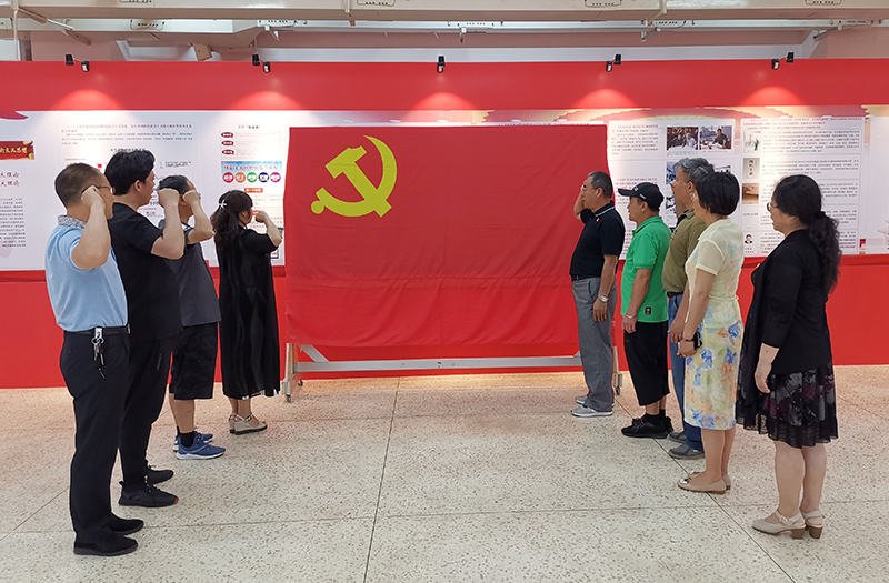 在昆明学院图书馆“习近平新时代中国特色社会主义思想学习园地”,全体党员参观了“真理之光照未来”主题展览。参观学习过程中,党员们在图书馆李静老师带领下,了解了习近平新时代中国特色社会主义思想理论渊源,创立发展、主要内容和历史地位。随后,面对鲜红的党旗全体党员重温了入党誓词。