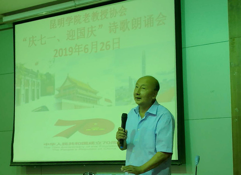 昆明学院老科协(教授)协会“庆七一、迎国庆”诗歌朗诵会在昆师路校区隆重举行。党总支副书记付晏昆代表学校离退休处对老教授协会举行“庆七一、迎国庆”诗歌朗诵会表示热烈祝贺,同时对老教授协会的工作给予充分肯定并提出了希望。张云权会长代表老教授协会发表了热情洋溢的致辞,对多年来关心支持老教授协会各项活动的学校领导、离退休处全体工作人员表示衷心的感谢!向多年来为党和人民的教育事业呕心沥血、教书育人不懈奋斗的老党员、老干部、老教授致以崇高的敬意。