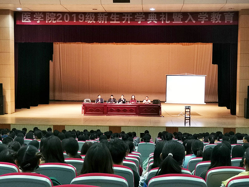 831下午医学院在学生会堂举行2019级新生开学典礼暨入学教育大会。医学院党书记王建华、院长余珊副书记张培宏、副院长杨兆宇、副院长陶剑系主任、2019级辅导员、班主任及485名新生参加了会,会议由张培宏主持。