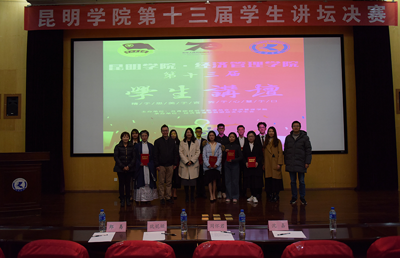 12月12日晚,由共青团昆明学院委员会、经济管理学院主办,经济管理学院团总支学生会承办的昆明学院第十三届学生讲坛决赛在惟行楼1501报告厅成功举办。共青团云南省委副书记(挂职)、共青团昆明学院委员会书记魏妮娅老师,共青团云南省委副书记(挂职)、云南广播电视台著名主持人周怀君老师,共青团昆明学院委员会副书记沈嘉老师担任评委。昆明学院校团委副书记郎易老师、经济管理学院团总支书记鲍鲲老师和200余名学生观看比赛。