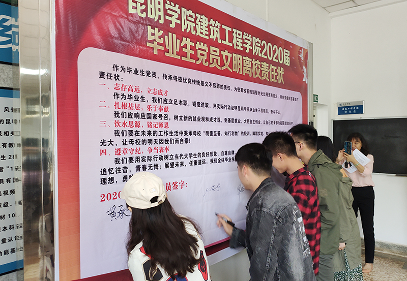 按照《中共昆明学院委员会关于庆祝建党 99 周年系列活动暨在常态化疫情防控中加强基层党建 “六个一”行动方案》要求,建筑工程学院党委于7月2日在惟行楼三号楼大厅举行建筑工程学院2020届毕业生党员文明离校责任状签字仪式。