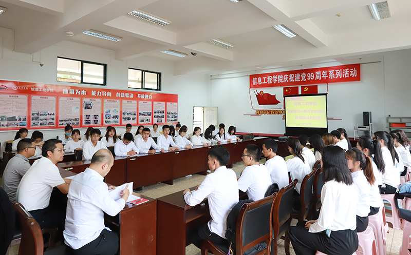 71日,信息工程学院党委开展庆祝建党99周年“六个一”系列活动之—“我用奋斗告白党”主题党日活动。党员同志戴党员徽章、温誓词、悟初心、讲奋斗,进一步增强党员意识,不忘初心、牢记使命,发挥党员先锋模范作用。学院党委书记陶军、专职组织员杨冬奎、学生支部书记毛雄建、36名新发展的预备党员以及学院的全体学生党员参加活动。