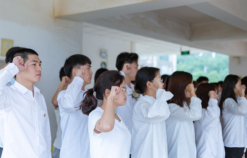 学院全体党员面对党旗庄严列队,党委书记陶军等党员亲手为36名预备党员佩戴了崭新的党员徽章,和新党员同志们一一握手,并表示祝贺。预备党员在陶军书记的带领下进行庄严宣誓,短短80字誓词是他们入党后的第一个承诺,表达了对党的坚定信念和为党的事业奋斗终生的决心。宣誓仪式结束后,陶军书记代表党委对本次宣誓活动作总结讲话,并对新党员提出要求。他强调,开展预备党员入党宣誓活动是增强新入党同志的党员意识、党性观念,进一步振奋精神、凝心聚力,继续前进的重要举措。他希望新加入组织的预备党员,一要增强党员意识,坚定选择,筑牢理想信念,在党言党,在党爱党,在党为党,在党护党;二要自觉接受党组织的教育、管理和监督,锤炼作风,提高素质,加强党性修养;三要不断加强学习,投身实践锻炼,在学习和生活中当标杆,做表率,努力发挥模范带头作用。