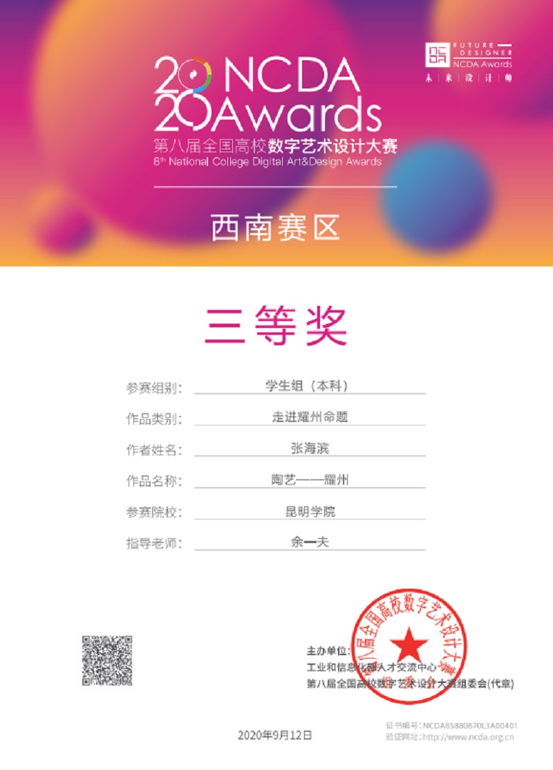 9月12日,在工业和信息化部人才交流中心主办的第八届全国高校数字艺术作品大赛(NGCA)比赛中,昆明学院建筑工程学院团总支书记余一夫老师荣获优秀指导教师奖,李可、朱鹏飞同学作品在“走进寻乌”命题赛中荣获西南赛区三等奖,张海滨同学在“走进耀州”命题赛中荣获西南赛区三等奖。