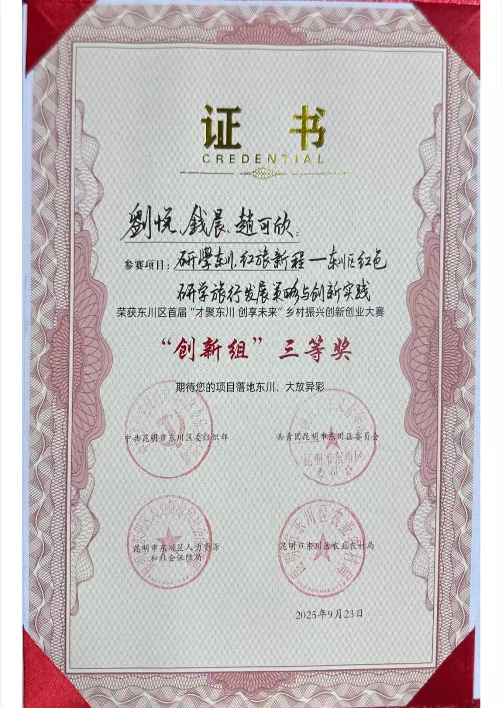 本次大赛共有500余名创新创业人员参与,169个涵盖特色农业、文旅融合、智慧乡村等领域的项目进行比拼。我校青年学子刘悦、钱晨、赵可欣团队的“研学东川,红旅新程——东川区红色研学旅行发展策略与创新实践”创新项目脱颖而出,荣获大赛创新组三等奖,获得奖金4000元,并现场与云南博轩文旅签署项目落地意向协议书,享受东川区相关产业扶持政策及大赛提供的28项支持政策,初步实现了“挑战杯”大学生课外学术科技作品竞赛成果的落地转化。