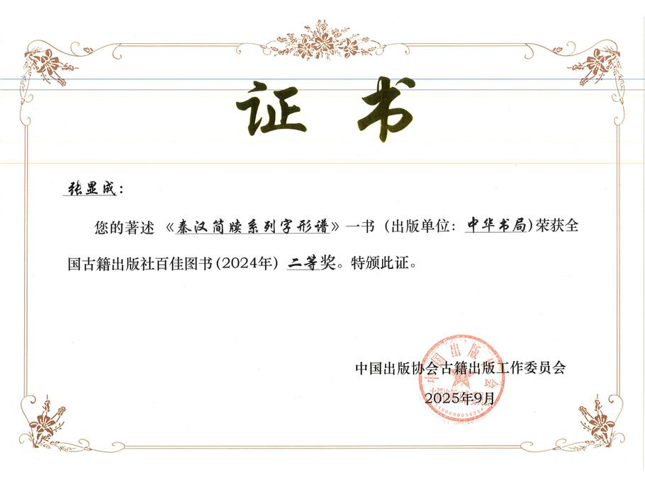 近日,我校人文学院特聘教授张显成主编的《秦汉简牍系列字形谱》一书,在第38届全国古籍出版社社长年会上荣获全国古籍出版社百佳图书(2024年)二等奖。