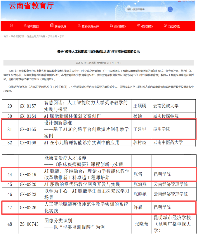我校三位教师的案例凭借鲜明的应用导向、创新的融合模式和显著的实践成效,在全省众多申报案例中脱颖而出,充分展现了我校教师在人工智能教育应用领域的扎实功底与创新思维。是学校推进 “昆明学院人工智能赋能教学计划”的阶段性成果,也是对我校教师数字素养与教学创新能力的充分肯定。