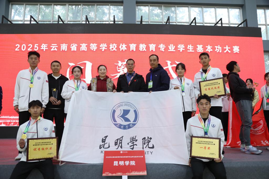 10月31日至11月3日,由云南省教育厅主办,云南省学校体育教学指导委员会、红河州教育体育局、红河学院承办的2025年云南省高等学校体育教育专业学生基本功大赛在红河学院举行,来自全省20所本科高校的代表队同台竞技。经过激烈角逐,昆明学院代表队凭借过硬的专业素养和出色的综合表现,荣获“团体一等奖”(团体总分第三名),同时获“优秀组织奖”“体育道德风尚奖”;两位指导教师荣获“优秀教练员”;6名参赛学生中,3人获一等奖、2人获二等奖、1人获三等奖,全面展现了我校体育教育专业学子的专业水平。